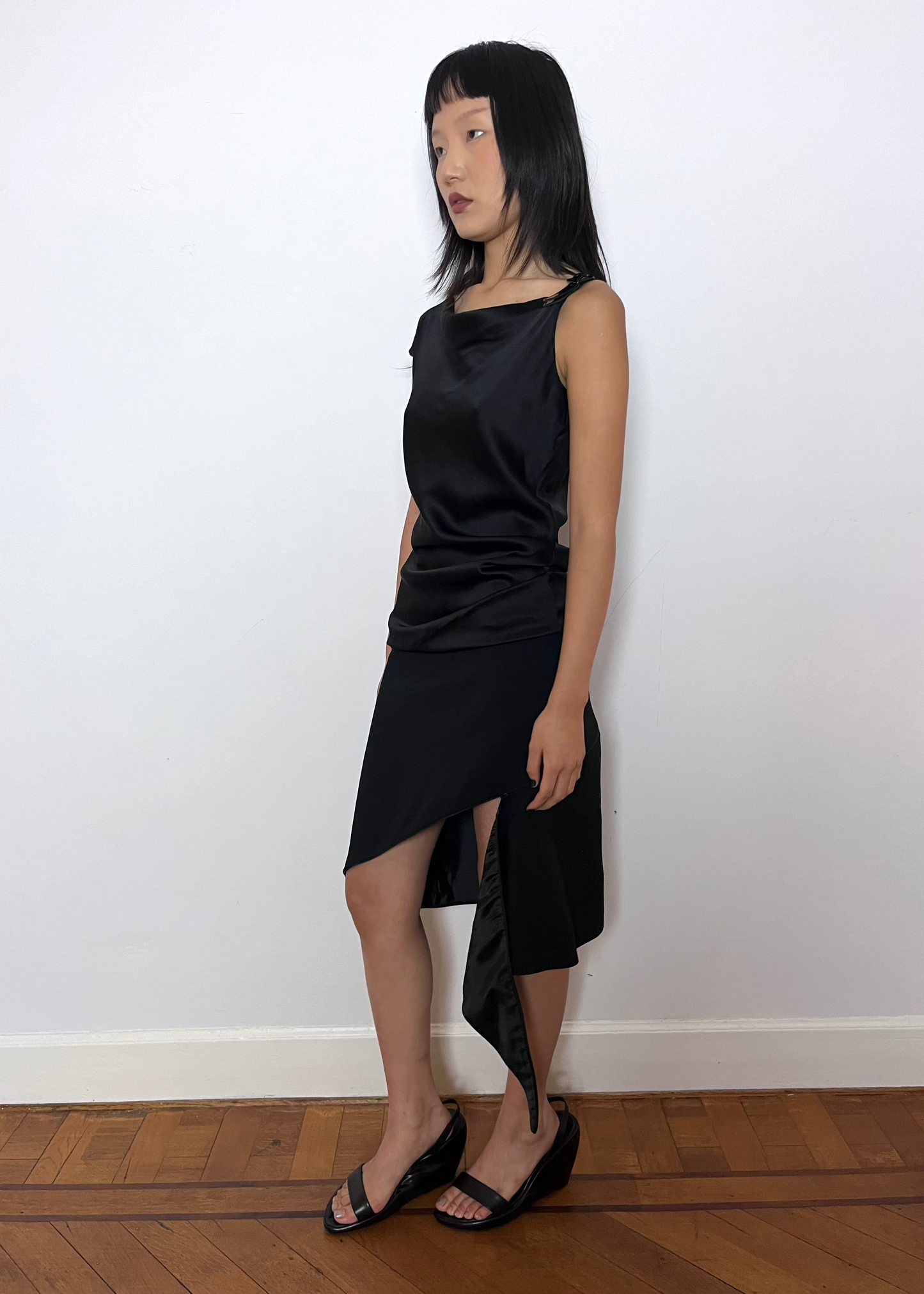 Black skirt featuring a diagonal zipper that extends to the waist, creating a draping. Fully lined.