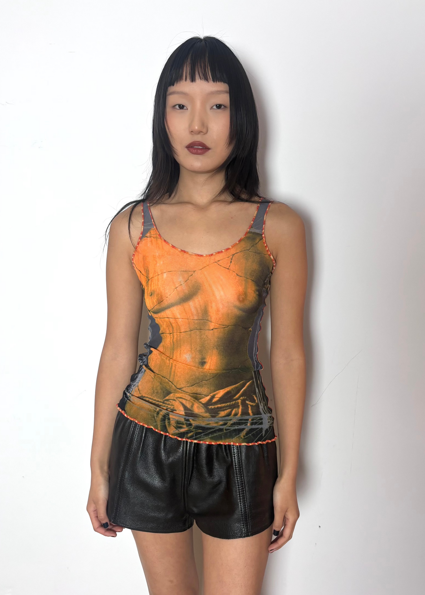 Mesh tank top with famous Venus de Milo print in blue and orange tones.